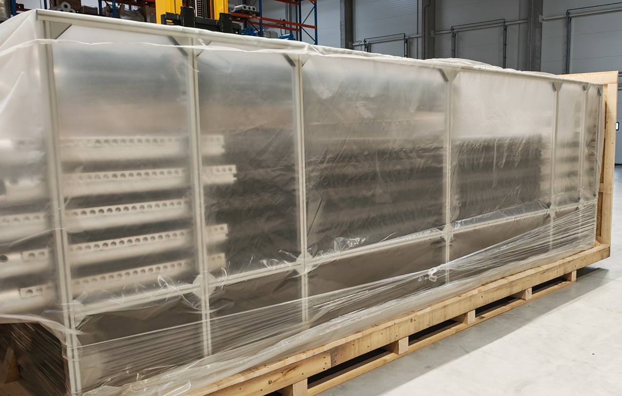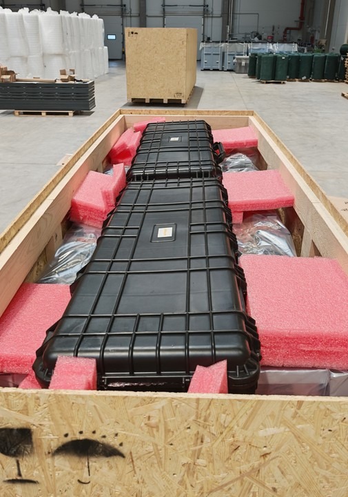 Každý svazek trubek byl nejprve zabalen do LDPE folie, která poskytuje pružnou mechanickou ochranu, chrání povrch karbonu před škrábanci a zároveň postačuje místo VCI folie, protože na tento materiál není nutná antikorzní ochrana. Do každé bedny jsme přidali vysoušecí sáčky, které udržují optimální suché klima po celou dobu přepravy. Navíc jsme použili indikátory nárazu a indikátory náklonu, které okamžitě upozorní, pokud dojde k otřesu nebo nesprávnému naklonění bedny během manipulace či přepravy. Nakonec byly bedny hermeticky uzavřeny a zpevněny, aby odolaly všem nástrahám námořní přepravy.