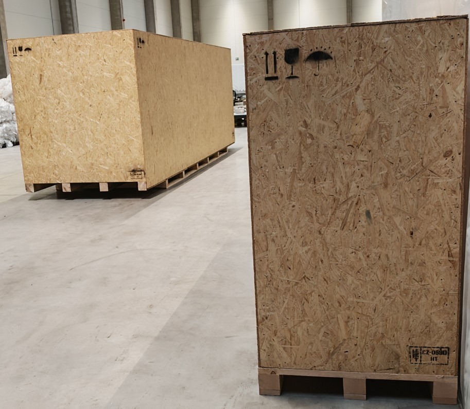 Pro transport jsme připravili dvě dřevěné bedny, každou přesně podle rozměrů části zásilky. Konstrukce z certifikovaného dřeva ISPM 15 zajistila bezproblémový průchod celní kontrolou v USA.